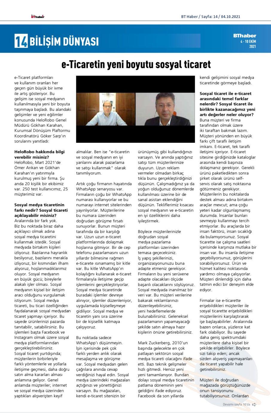e-Ticaret platformları ve kullanım oranları her geçen gün büyük bir ivme ile artış gösteriyor.Bu gelişim ise sosyal medyanın kullanılmasıyla yeni bir boyuta taşınmaya başladı. Bu alandaki gelişimler ve eğilimler konusunda HeloRobo genel müdürü Gökhan Karahan,Kurumsal dönüşüm direktör Göker Sarp'ın sorularının yanıtladı.